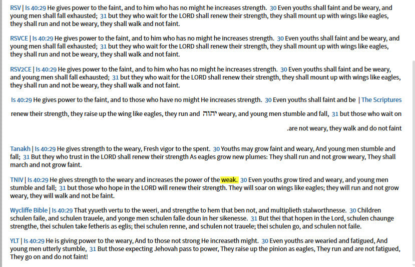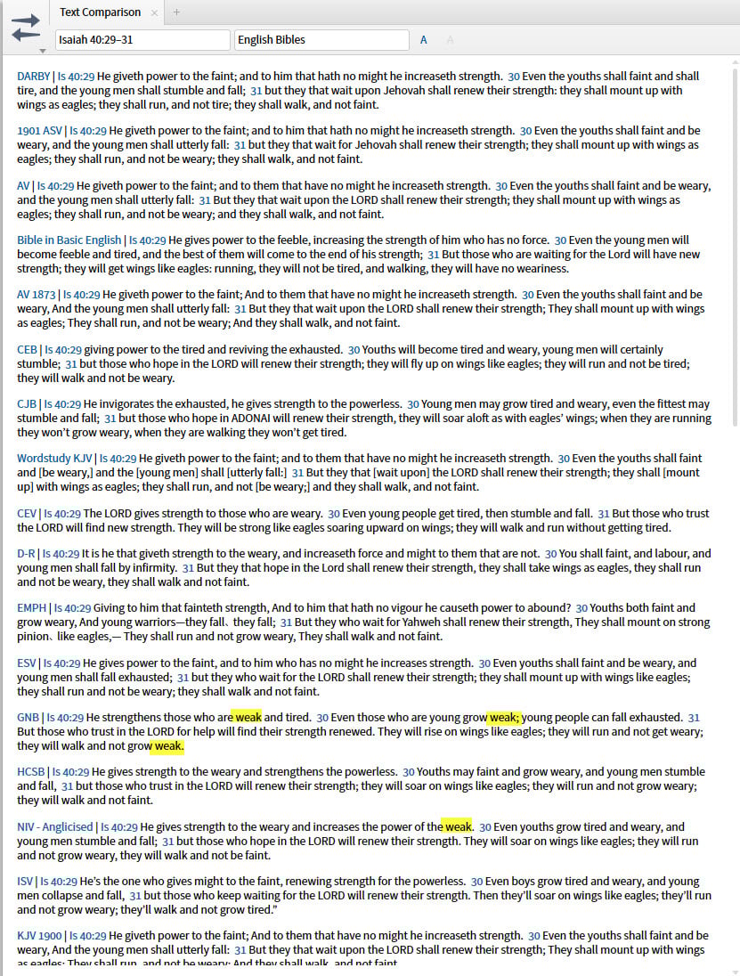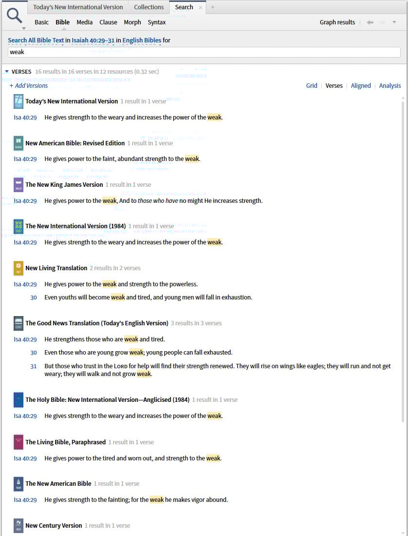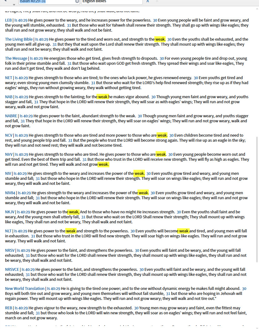 But I have 53 English Bibles. It would be very helpful to be able to filter the results sometimes. For example, in this case I'd like to find all version that render the text in question using the word "weak" (as opposed to "powerless") because I'm looking to copy this quote to use for a card for someone who is in the hospital undergoing cancer treatment, and "weak" just sounds more apt under the circumstances.