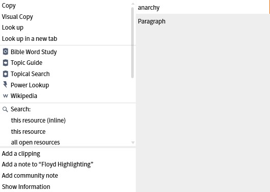 It would be helpful if I right click on an English word if the option of seeing an English dictionary appeared:when right clicking. Two helpful options do pop-up (Wikipedia and word study), but both of these seem overkill when all one wants is a definition. Even access to an on-line dictionary would be helpful.