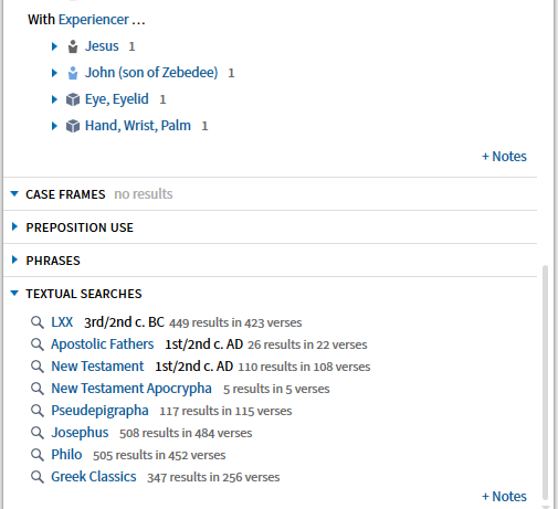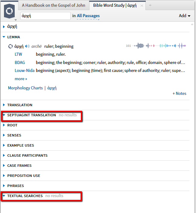 It seems, the section "Textual searches" does not work at all, same with "Septuagint Translation"