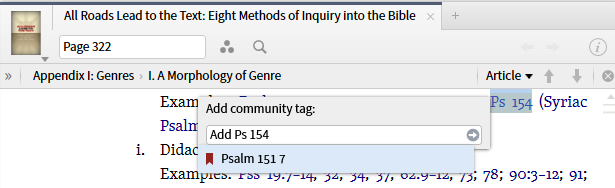 According to https://www.logos.com/support/windows/L3/book_abbreviations the appropriate format is Add Ps 154 for the Biblical reference to Ps 154. However, I am unable to use a community tag to set this standardized value: