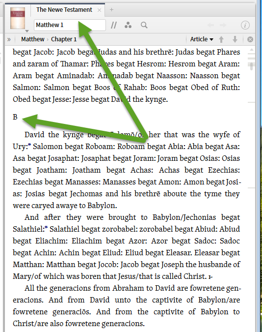 The Tyndale Newe Testament uses A, B, C ... to mark units within a chapter rather than marking verses. These are not included in the indexing leaving Chapter the smallest level to which I can refer, select etc. ...