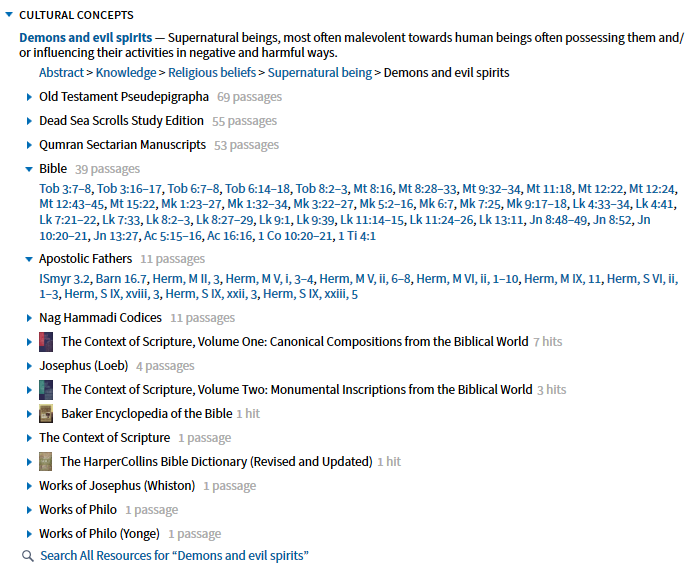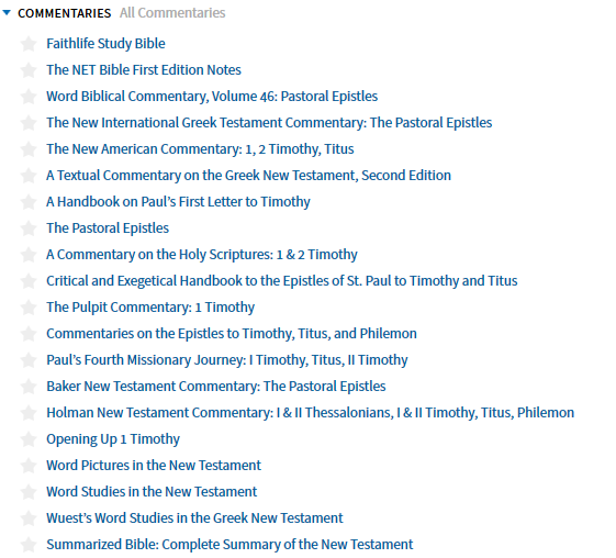 The third and final screenshot I will include is from the Passage Guide. There are no thumbnail images at all. Given the amount of commentaries many Logos users have, this is one section in particular that could probably benefit from having images added. My commentary list is much longer than what is shown below, and I do not always remember which commentary is from which set based on the information currently provided. For example, the eighth entry listed (if I am counting correctly) simply says "The Pastoral Epistles." Just by looking at that, I have no idea who wrote that commentary or what set it belongs to. A thumbnail image and description will appear if I move my mouse over it, but I would not need to do that if a thumbnail image were already available.
