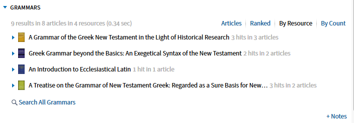 This first screenshot was taken from the Exegetical Guide. It lists the grammars that have a hit for the verse I was looking at, and it provides a thumbnail image for each grammar.