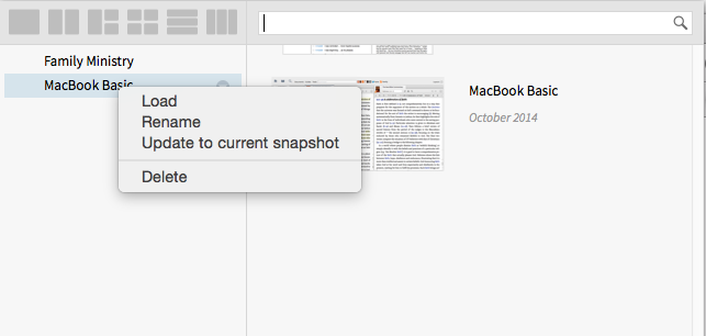 I don't know what the "update active" does... The list on the left hand side is the "saved" layouts, so "update to current snapshot" would be saving a new starting point.