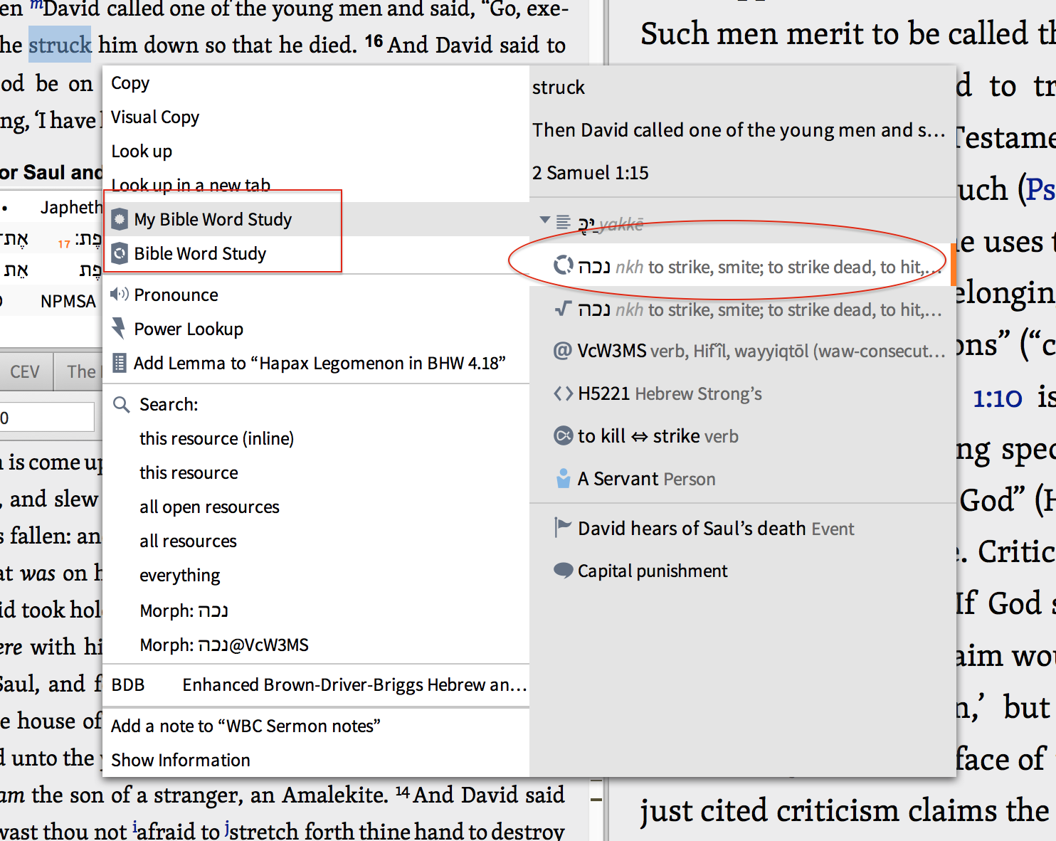 This is my first post to this forum. A while back (after an upgrade) one of my favorite features disappeared. When working with the UBS text, I'd right-click (Mac version 5.2b) a word and select "Word Study" option from the popup and immediately generate the word study for the word. When it broke, I got around the problem by selecting Word Study from the Guides and pasting in the canonical form into the search box, but this takes several extra steps and I use this feature all the time. Then even that method broke; the guide would not let me type in a different word. (it got stuck on οἰκοδεσπότης). I called in and good support from Brian on the second level helpdesk--he upgraded to the core to version 6, which fixed the problem with pasting a new word in the search box, but the one click option to get from a word in the text to the word study doesn't appear on his reference system. He suggested I post to this forum for HELP!