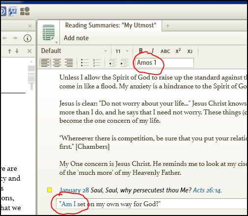 You'll see below that, for some reason (?), the phrase "Am I" was automatically hyperlinked to Amos 1 (as seen in pic) by L4. I wish it wouldn't do that, but that's life I suppose. My problem is that I can't remove it. When I erase the "Amos I' in the hyperlink box it returns as soon as move back to my note.