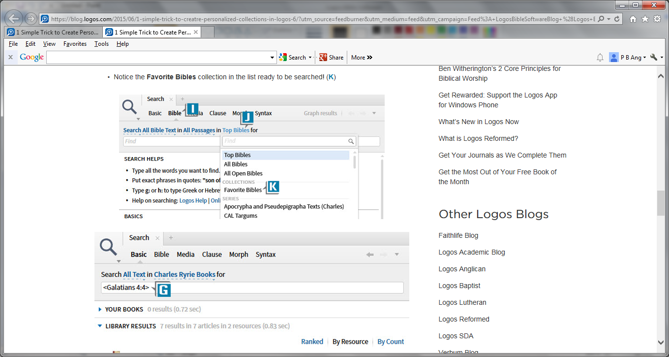 I was following the post from Morris Proctor of June 8, 2015. About mid way through the illustration, where the search was made of the "Favorite Bibles" collection, what follows was a search of "Galatians 4:4" in "Charles Ryrie Books".