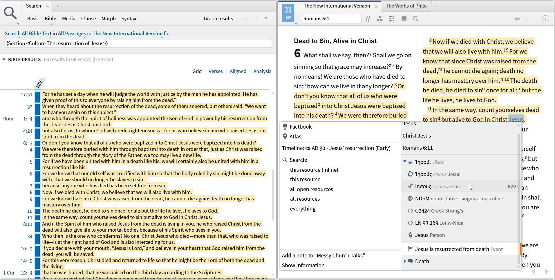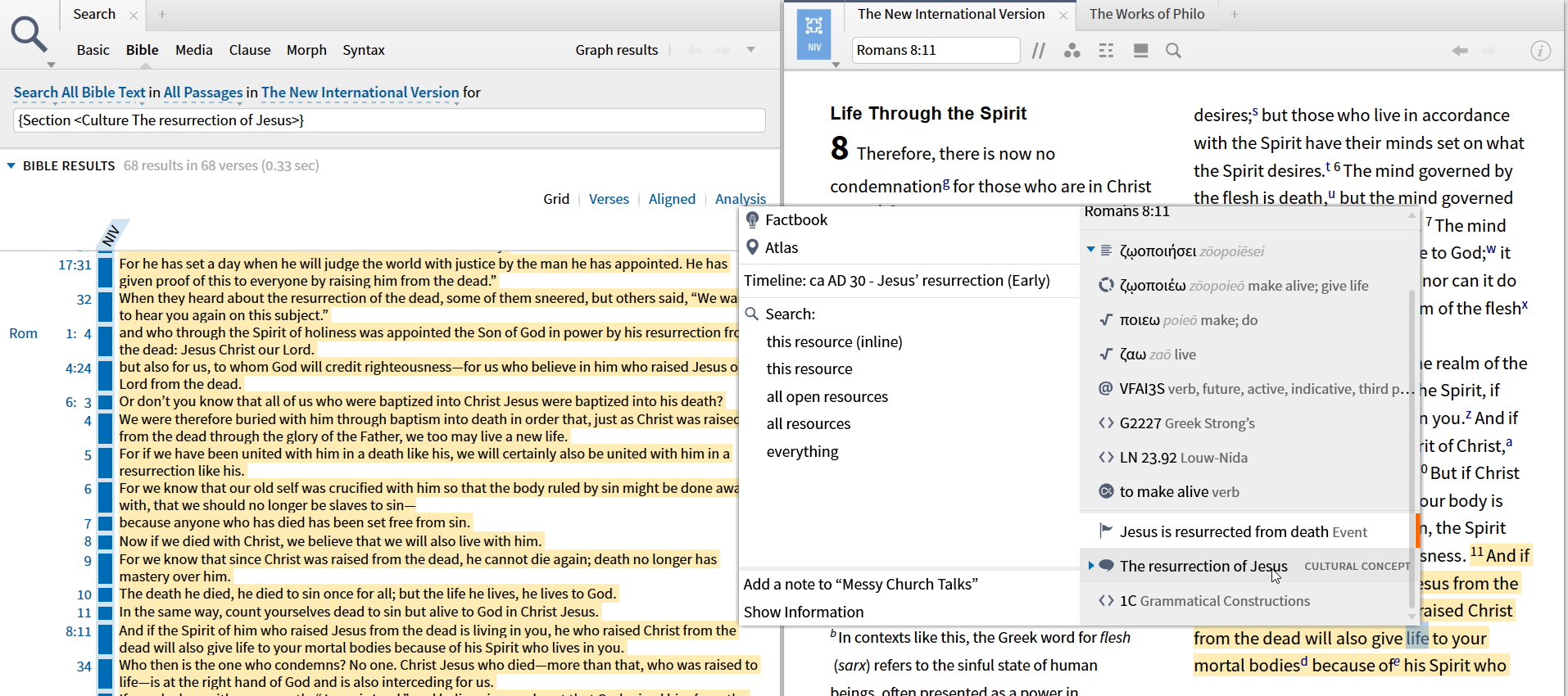 As the screenshot below shows a search for the cultural concept "The resurrection of Jesus" finds hits against Romans 6:3-11. But right-clicking on a verse in that section doesn't show that tagging - just tagged with the concept "death"