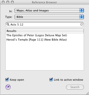 I have created a collection with Maps, Images and Atlases. I have the reference browser linked to the active window. I am browsing along in the ESV and when I get to Acts 5:12, reference browser shows me a map and an entry in 'New Bible Atlas'. The map opens just fine, but when I click on Bible Atlas, it crashes out. Below is a screen shot of what my reference browser looks like before things come to a screeching halt. The only way to get out of this is to do a force quit on Logos.