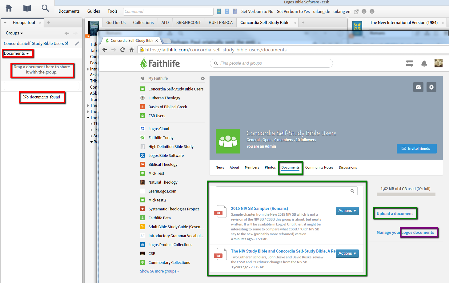 - What I think is going on here is that the Groups Tool says "documents" when it actually means "Logos documents" (as the purple box in the screenshot from the website clearly says). This would be perfectly okay in L6 if not for the fact that Faithlife groups do have a Documents tab which allows sharing non-Logos documents. This needs to be renamed to "Logos documents" in at least the two lower marked red boxes.