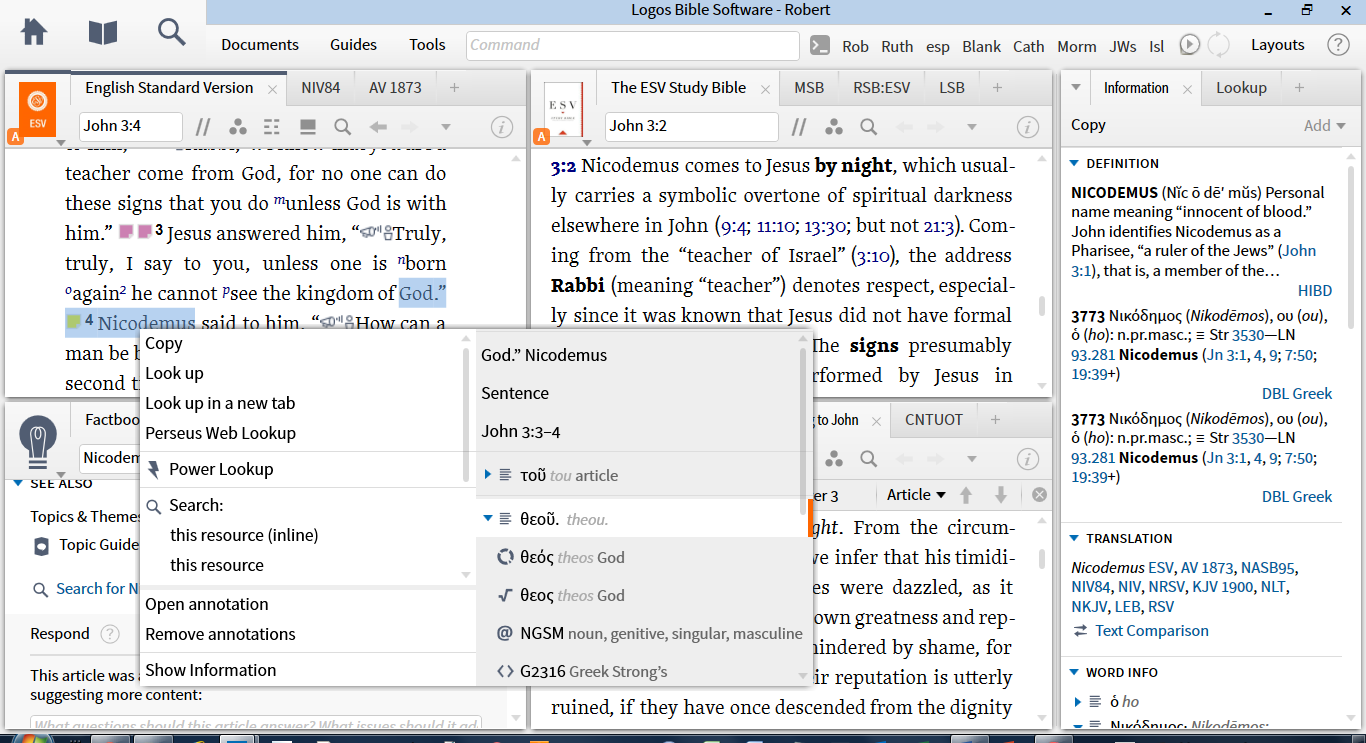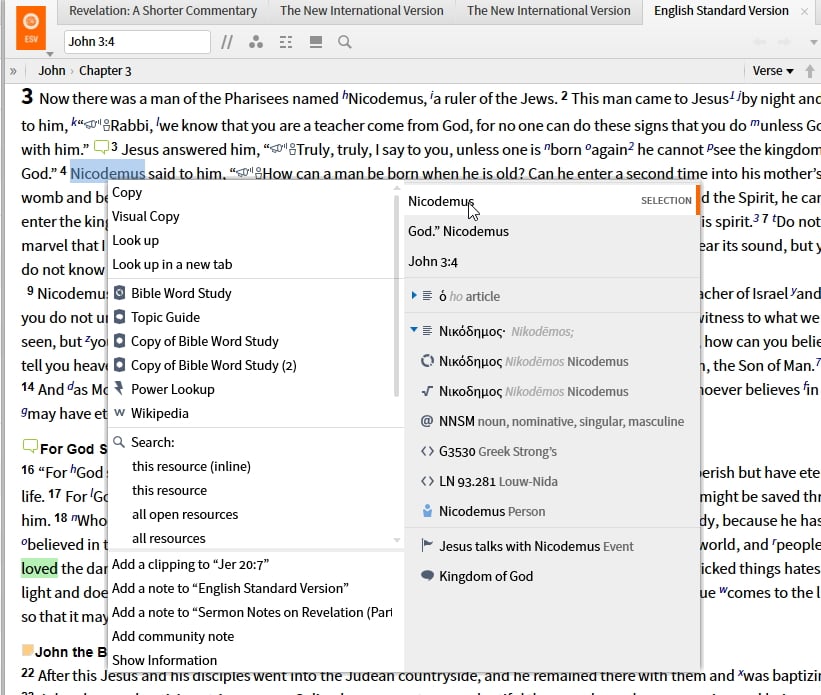 With Text Selection set to Smart, I right click on "Nicodemus" in John 3:4 (ESV), both "God" and "Nicodemus" are selected and the context menu is for "God":