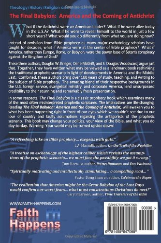 What if the Antichrist were an American leader? What if he were alive today and living in the U.S.A? What if he were only a few years away from revealing himself to the world? Instead of being omitted from Bible prophecy as many of the major eschatology scholars have taught for decades, what if America were at the very center of Bible prophecy? What if the U.S.A., rather than Europe, Rome, or Babylon, were the power base of Satan’s conspiracy against the Kingdom of God? These three authors, Douglas W. Krieger, Dene McGriff, and S. Douglas Woodward, argue just that. Together, they have written what may be seen as a landmark book rethinking the traditional prophetic scenario in light of developments in America and the Middle East. Combined, these authors bring over 100 years of study, teaching, and writing to the subject of Bible prophecy. The amazing blend of their respective backgrounds in the foreign services, evangelical ministries, and corporate America, lends unsurpassed credibility to their stunning and remarkably fresh presentation. In some respects, The Final Babylon is a classic prophecy book, rich in exegesis of key scriptures most often overlooked or misinterpreted. The implications are life changing. Reading The Final Babylon, America and the Coming of Antichrist will awaken you to what has been happening right in front of our eyes that we simply couldn’t see due to our love of country and our faulty assumptions concerning the antagonists in the traditional prophetic scenario. This book may change your politics, your view of the Bible, and what you do day-to-day.