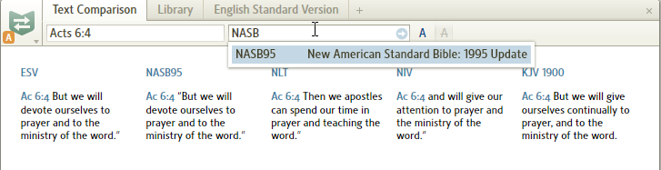 Typing NASB into any place that allows a version selection only shows the NASB95, even though I have the original NASB as well. This includes the Bible search window, the text comparison, copy bible verses, etc. (I can select in Basic search, but not Bible search.)