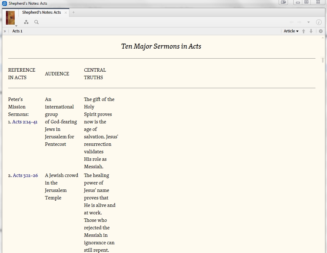 The contents page for each Bible Book is simply comprised of a list of the Bible chapters but below is a snippet of a sample from Acts about 10 sermons in the book. I saw many such nuggets in my brief overview of several of them.