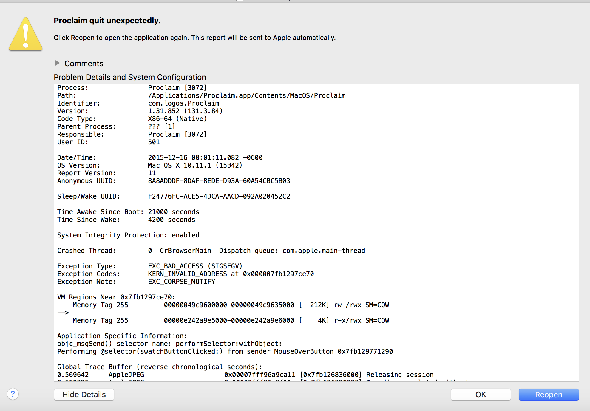 Prior to the latest release, I was already having problems with Proclaim crashing after accessing and working in effects for text. Since the latest release, this has become much worse. Almost every time I access effects and make a selection, Proclaim completely crashes. Fixes?