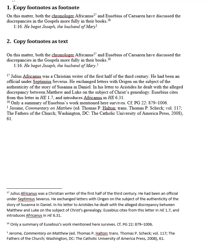 - When I enable "Copy Footnotes" and choose "Text" as the option, I still see unlinked text numbers in the body of the copied excerpt, like this: "On this matter, both the chronologer Africanus and Eusebius of Caesarea have discussed the discrepancies in the Gospels more fully in their books.18"