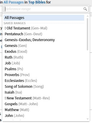 I always used to be able to keep my OT and NT Saved Ranges (which I use more often than all the others) up at the top of the list by making special names for them with ! prefixed to them, and the sort order would keep those at the top. That might have been accidental behavior that was never intentional, but whoever reworked the code recently broke that. And it was a useful little thing to count on. So I'd like to register a complaint. Now the prefix characters are ignored so the special saved ranges sort in biblical order with everything else, which ruins the effect.