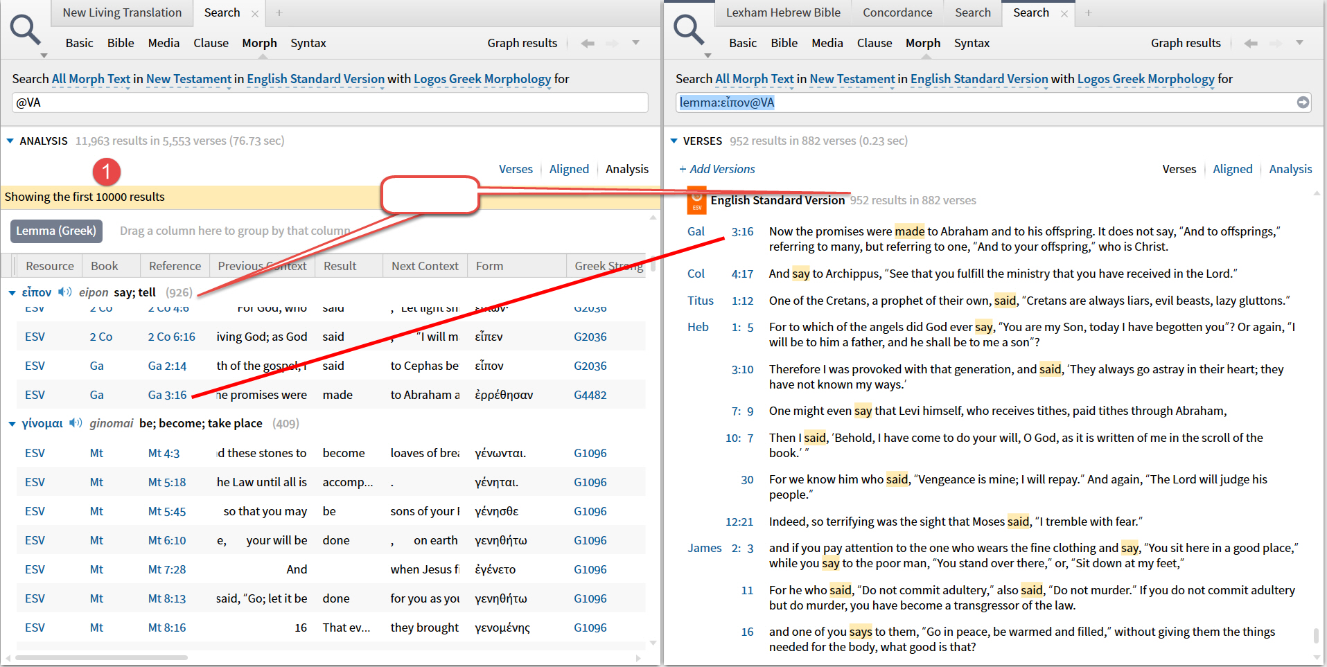 As you can see from the screenshot the Analysis views stops listing terms after Galatians 3:16. This may be related to the note about it just showing the first 10,000 results (1)