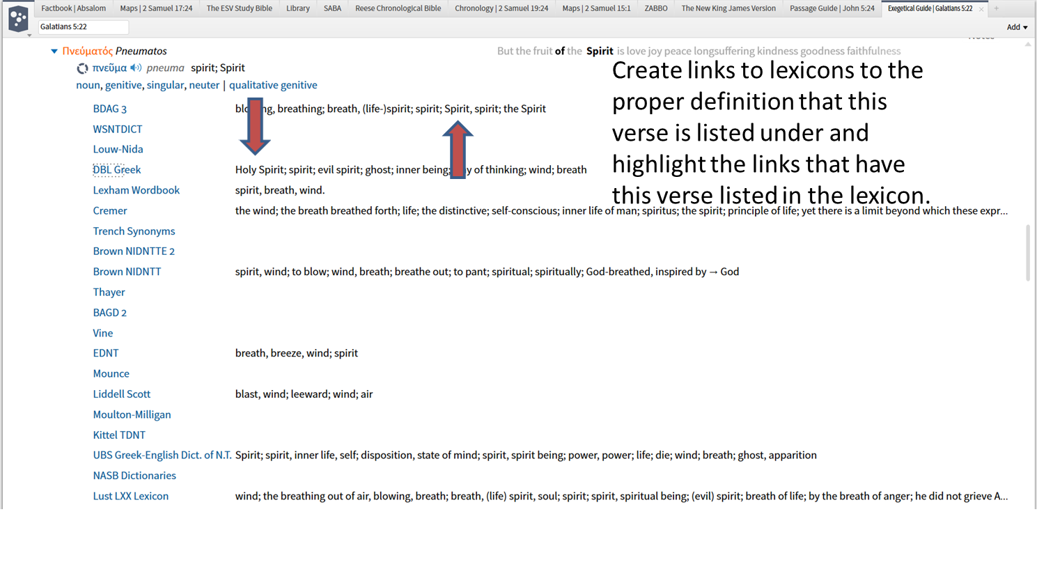 I would like to see links to the appropriate place in the lexicon that a definitions falls under. For example in Galatians 5:21 the words Spirit can mean Holy Spirit, human spirit, wind, breath, ect. In the context of Galatians 5:21 it means Holy Spirit. I would like to see a link to all the lexicons that have Galatians 5:21 listed under a certain definition. Instead of jumping to the head term we can go directly to the appropriate definition.
