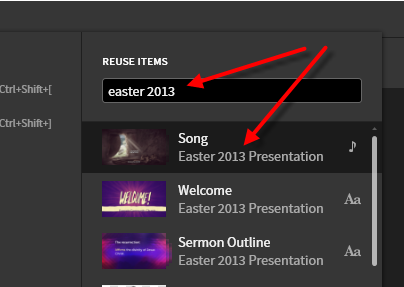 When working on a new presentation, we often want to transfer slides from previous presentations. It would be nice if there was the ability to filter the choices in "Add Item" by those previous presentations. Finding things would be so much easier. (this might also answer my previous suggestion to add a "save as" function since you could select an entire presentation and put it into the new one, thus saving it as something else).