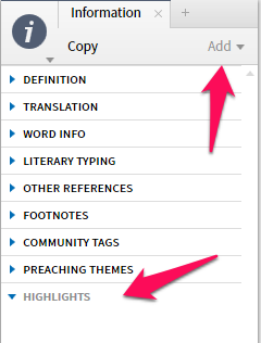 A quick easy way to search for highlights in a resource is to use the Information Pane (From the Tools Tab). Be sure to add "highlights" if it is not present.