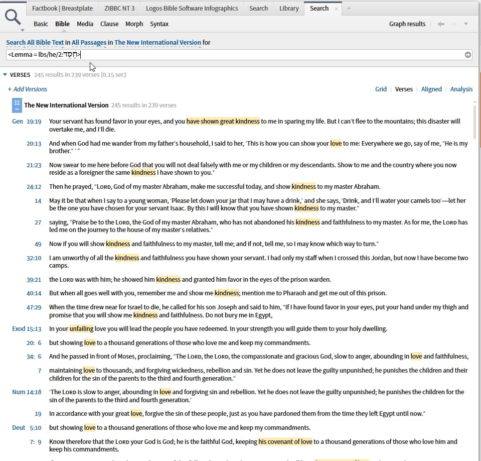 If you were interested in only searching the LEB you could choose that Bible alone to search. With your results you might create a passage list for further study.