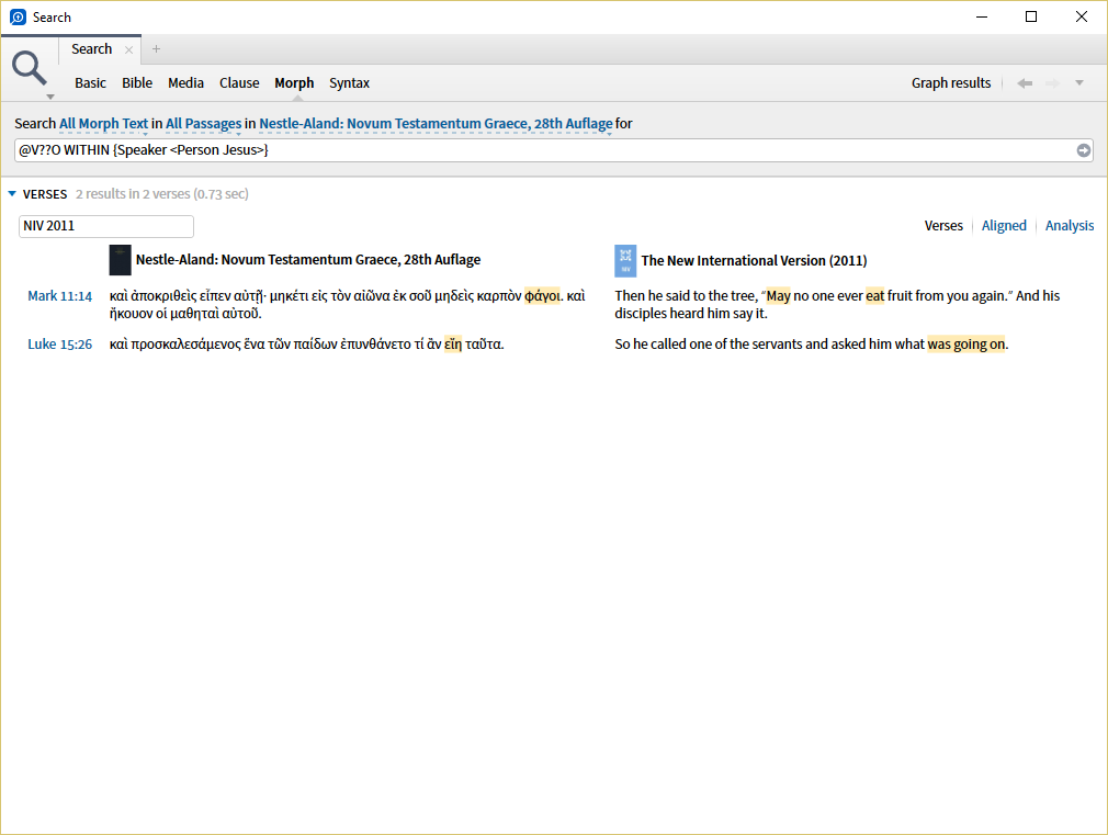 A Morph search for @V??O WITHIN {Speaker <Person Jesus>}
