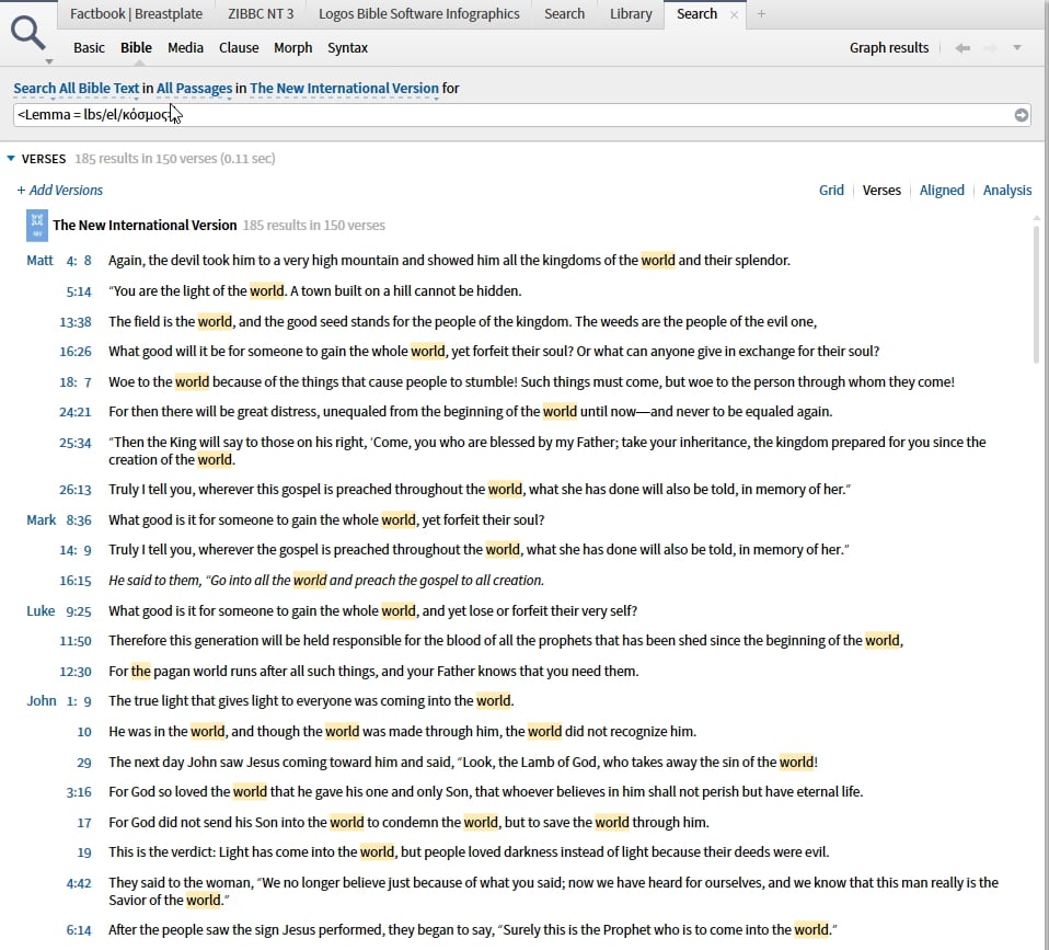 It seems you are searching for surface text instead of lemma, which e.g. won't find στοιχεῖα when you're only looking for στοιχεῖον.. . .