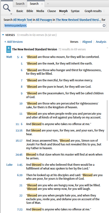 Using verb-lemma:μακάριος does not find all instances of the lemma μακάριος in the LSGNT. A sample is shown below. A lemma search using the normal Bible Search tool finds all of them.
