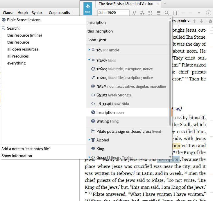 The results include Jesus referred to as Him to those that followed The Lamb in Revelation. Here is a screen shot of the verse and analysis views. This feature alone is worth at least the minimal upgrade to L5 and running it on a Mac is truly a joy.