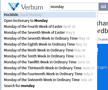 5. Not mentioned in Help but also available are liturgical dates. Here an additional option "open lectionary" will consistently appear. Again there is a default layout that will be returned when you enter a liturgical date.