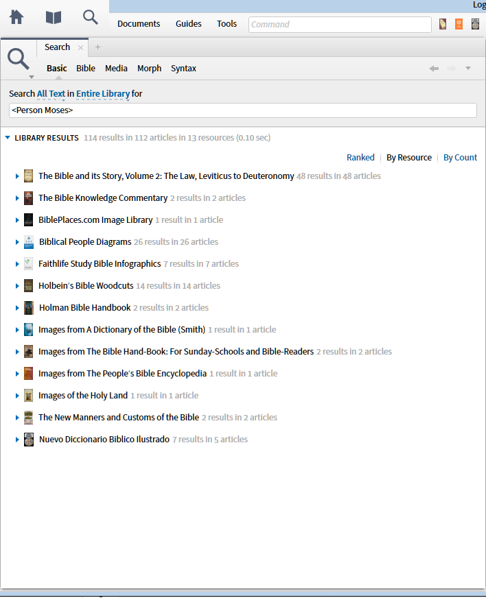 Here is the result from Basic Search <Person Moses>, but ordered by resource, sure enough , there are no bibles in the list of resources:
