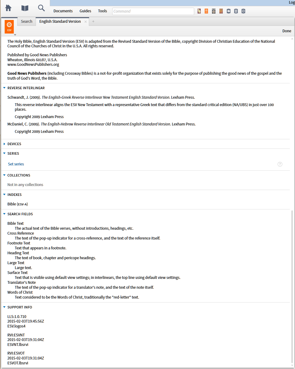 Also, here is the Information on the ESV Bible, under the Support Info: