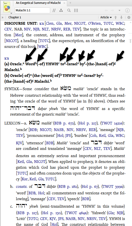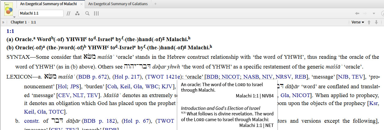 But something works [8-|]: hovering the mouse pointer on the Bible version shows the correct version in the text box (the pointer hand was on the NIV but is not visible in this screen copy). It only works with Joel and Malachi, and not in other Exegetical Summaries, and perhaps in no other resources either, although it would be a nice feature and could give Logos more competitive edge