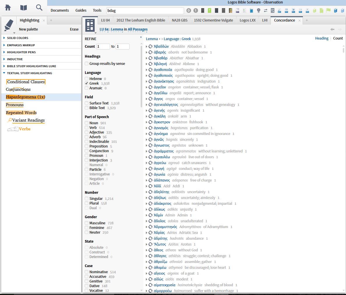 I can find all Words in NT, i also have a HC of a Concordance where I can look all Hapaxlegomena in Luke (but not saying the Vers) So, I could simple read through all Words and find out wich one is Single, but can I find this with the Concordance Tool. I can limit to Luke but that don't show me all NT Words.