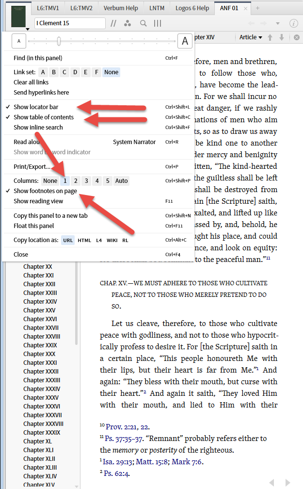 8. The resource panel menu gives us access to some features already mentioned such as the table of contents and locator bar. It also allows us to put the resource in page mode by setting the columns to something other than none. Then we can navigate prior-next page via the arrowheads at the bottom of the page.