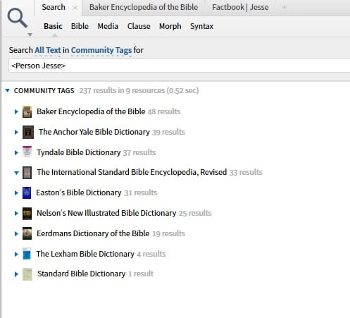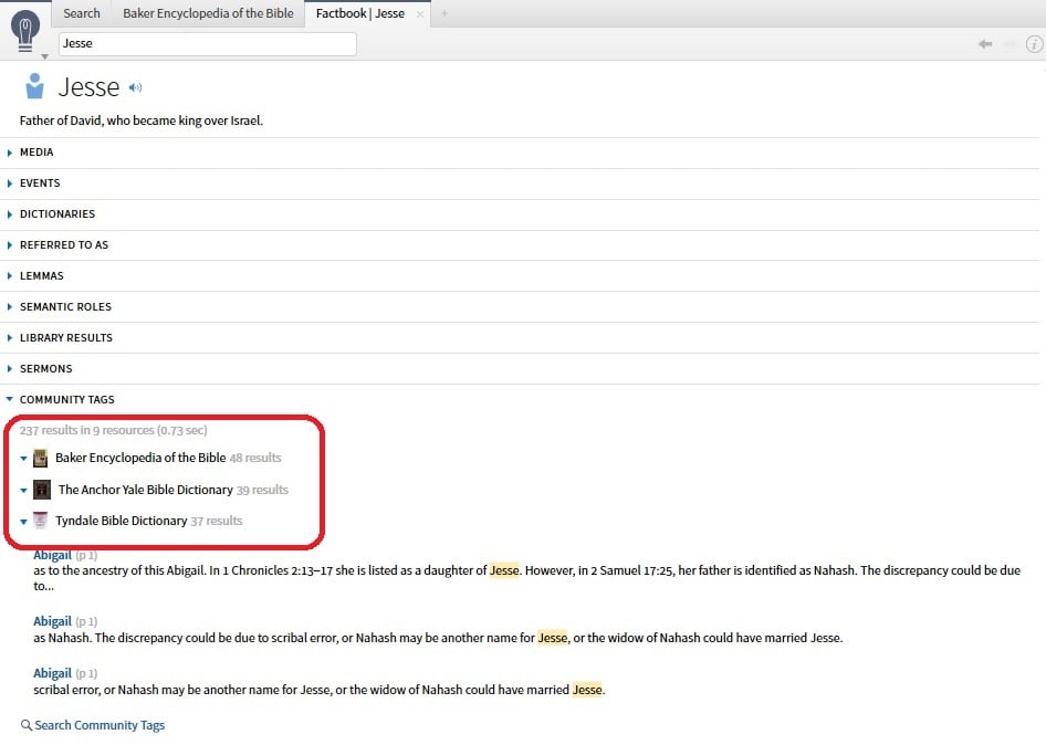 - Expand Community Tags section, you probably have three - Baker Encyclopedia, AYBD, Tyndale Dictionary. Baker says 48 results, AYBD says 39 results, Tyndale says 37 results.