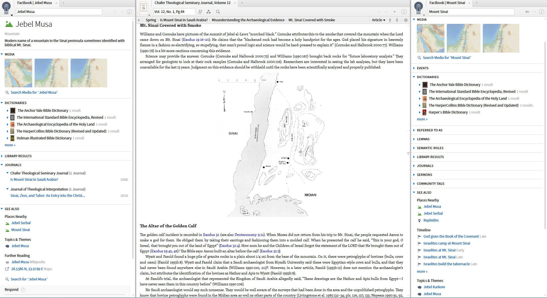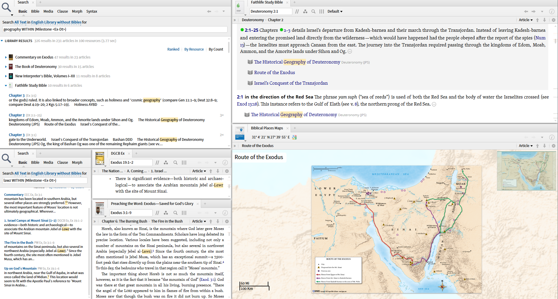 Faithlife Study Bible has link to Biblical Places Map "Route of the Exodus" that shows a traditional route through the Sinai peninsula. Clicking on Jebel Musa opens Factbook: