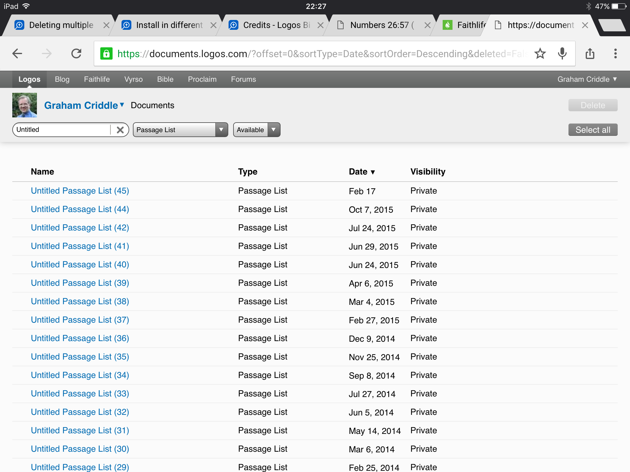 Selecting multiple passages lists in the application in order to delete them all at once should work. Don't click on the title of the document, since that will open it. Instead, click in the blank area to the right of the title, or on the document type or date.
