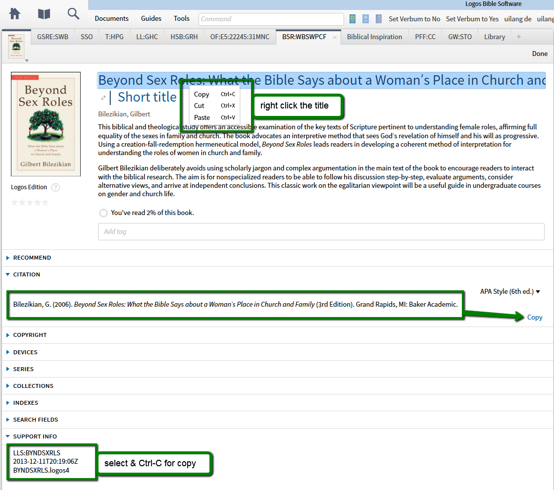 I assume you mean the "support info" with short code, right? select and either Ctrl-C or right-click and choose copy from the context menu. Or did you mean the Short Title? Same as the long title, however most resources don't have that. Or did you mean the tab name ("BSR:WBSWPCF" here)? This is either the short title or an on-the fly production of Logos, derived by simply taking the first characters from the title words, in no way official or meaningful.