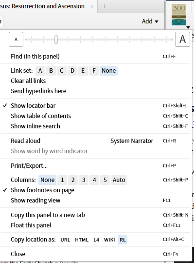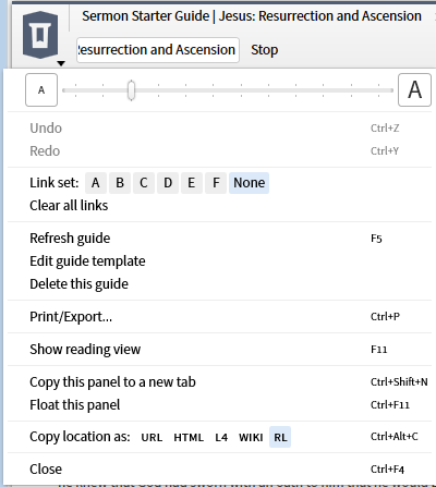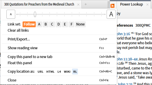 5. The next function is the Link Set. Until recently, this was limited to tying resources with the same indices together so that they scroll together. A recent addition has allowed one to link a Greek or Hebrew lexicon to an English Bible Bible New Feature: Link a Lexicon to a Bible (feature). There is no master/slave relationship so that moving any resource in a linkset will move the others. If one wishes to have a master resource, consider using the new multi-view feature New Feature: Multiview Resources (Tool). You may have up to 6 linksets identified by letters A-F.