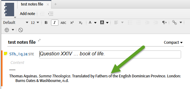 33. The Show citation option toggles whether or not the citation is added to a note when you create it from a resource selection. If you edit attachment points to add additional links, the multiple citations will be shown.