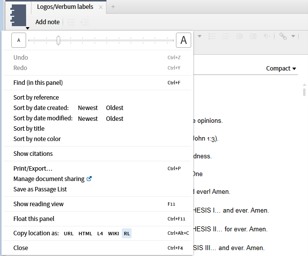 28. Note documents have several additional functions related to note sequence in the Panel Menu. The first of these is Sort by references which will arrange notes by their location in a resource and sort resources into alphabetical order.