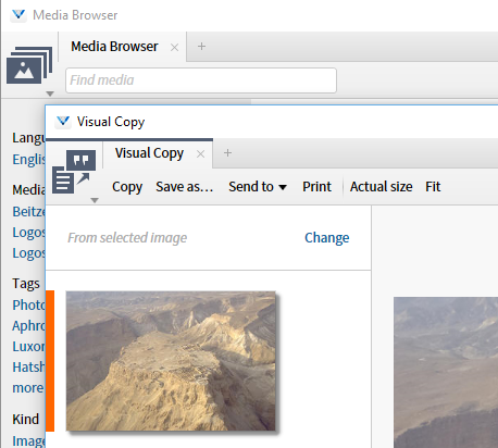 Some of the Tools have tool specific options on the Panel Menu. They will also at times promote items usually on the Panel Menu to the tool bar, e.g. Media Browser ==> Visual Copy has the Copy, Save, Send to and Print on the tool bar.
