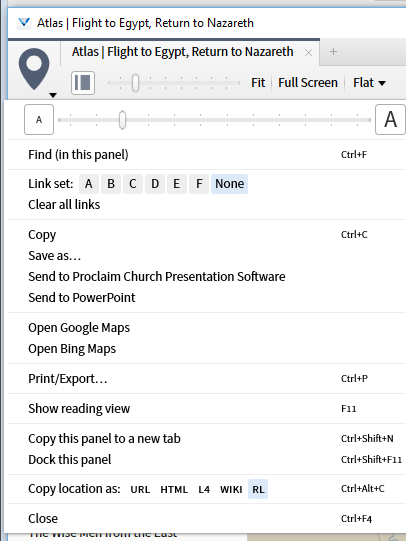36. The Atlas tool has several tool specific functions in its Panel Menu. The first of these is to Send the map to the Proclaim Church Presentation Software.