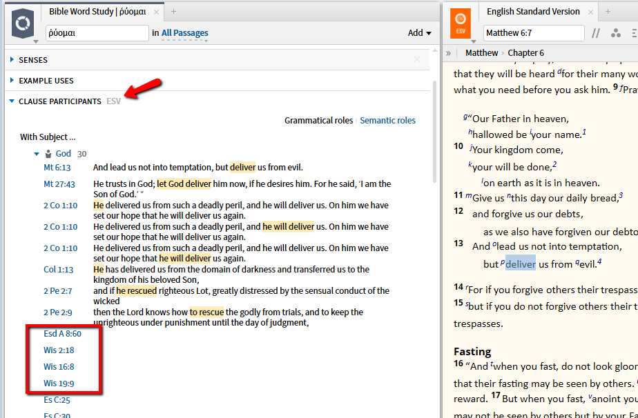 In my BWS in the Clause Participants section, I'm getting hits from the apocrypha. I didn't think the ESV had the apocrypha. (And I don't want the apocrypha taking up space in the results.)