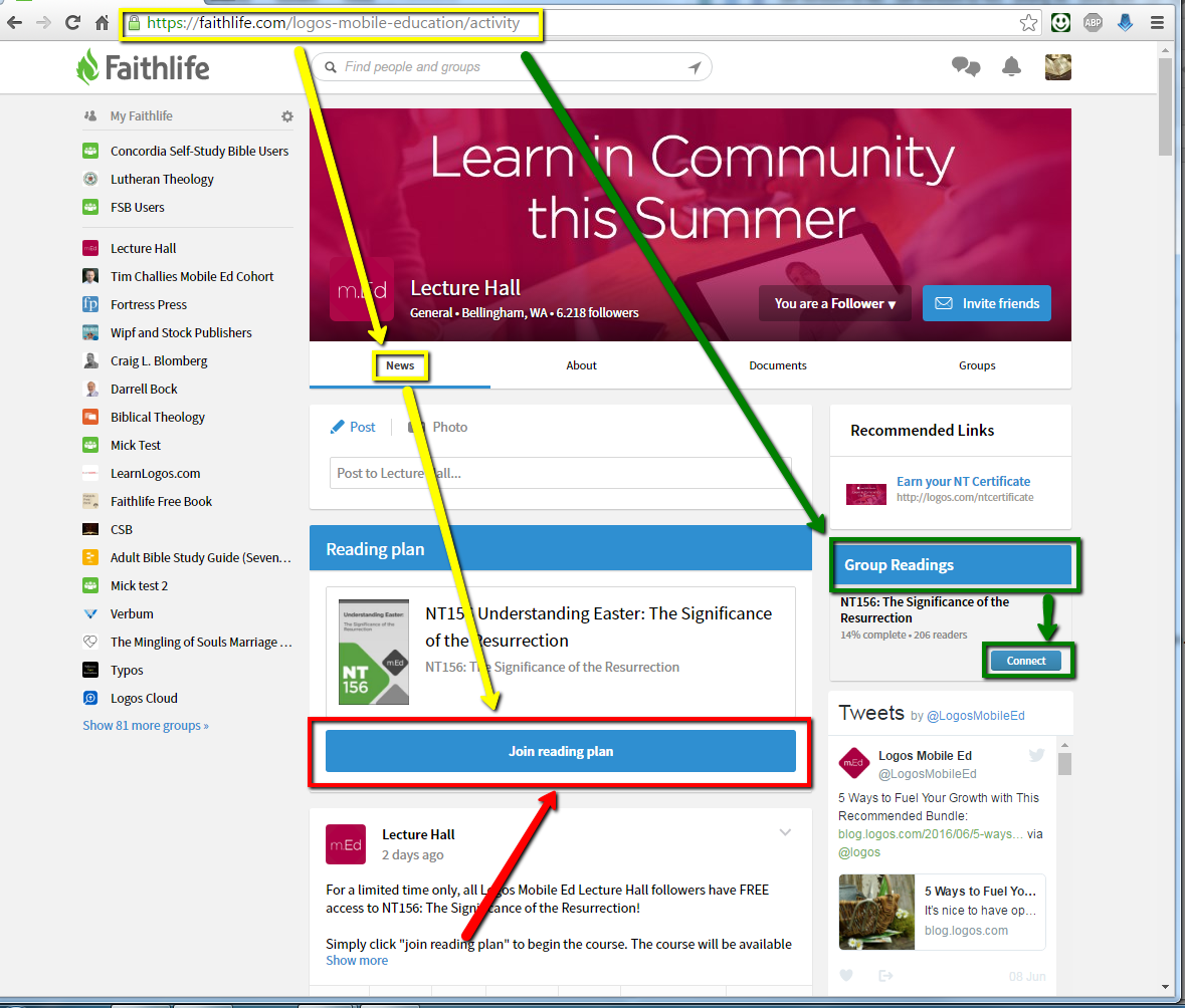 - 2. If you're anyplace else in the group's faithlife page, you should at least see the sidebar widget for the Reading Plan, where you can connect, too, as shown by the green arrows.