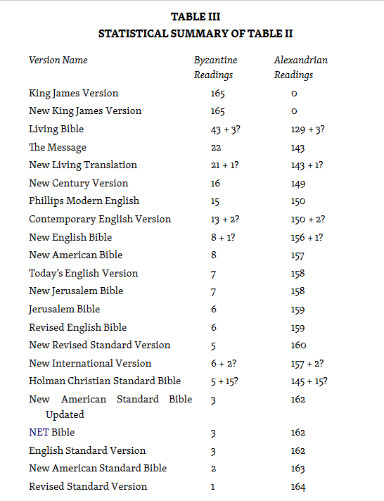 Percentage agreements are not too meaningful because the list of passages is not exhaustive, but it is of interest to rank the translations in the order of their closeness to the Alexandrian family in this set of passages. The resulting order is RSV, NASB, ESV, NASBU, HCSB, NIV, TNIV, NRSV, REB, JB, NJB, TEV, NAB, NEB, CEV, PME, NCV, NLT, MES, and LB. (The NIrV follows the same textual basis as the NIV). The last in this sequence is the Living Bible, but it still agrees with the Alexandrian reading in 86% of these 165 passages.