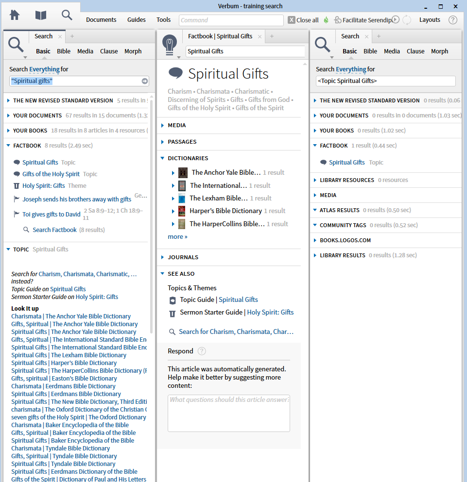 1. The Search on the right looks for the precise topic label of <Topic Spiritual Gifts> of which there is exactly one matching entry in Factbook. I do not understand why it fails to find the dictionary entries, sorry.