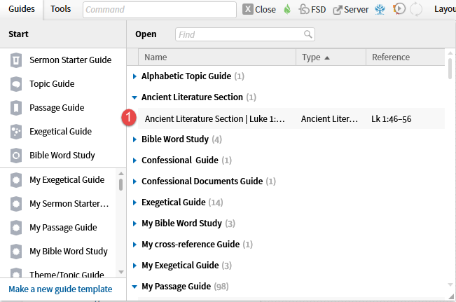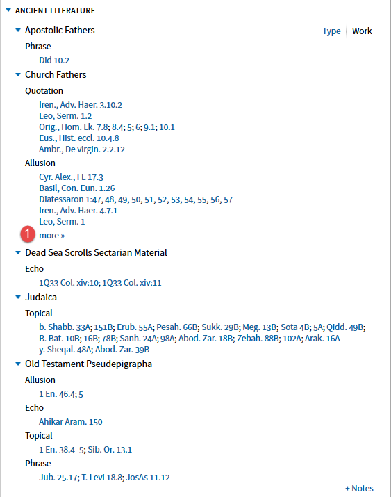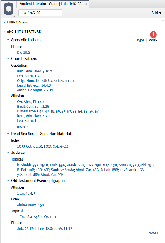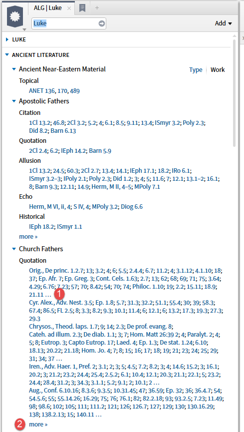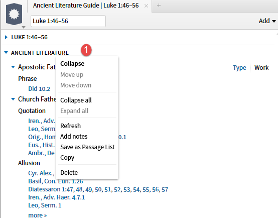 The option to Save as Passage List deserves special mention. The Ancient Literature guide section does not provide a short sample of the text as the Search results do. However, you can save the references as a Passage List.